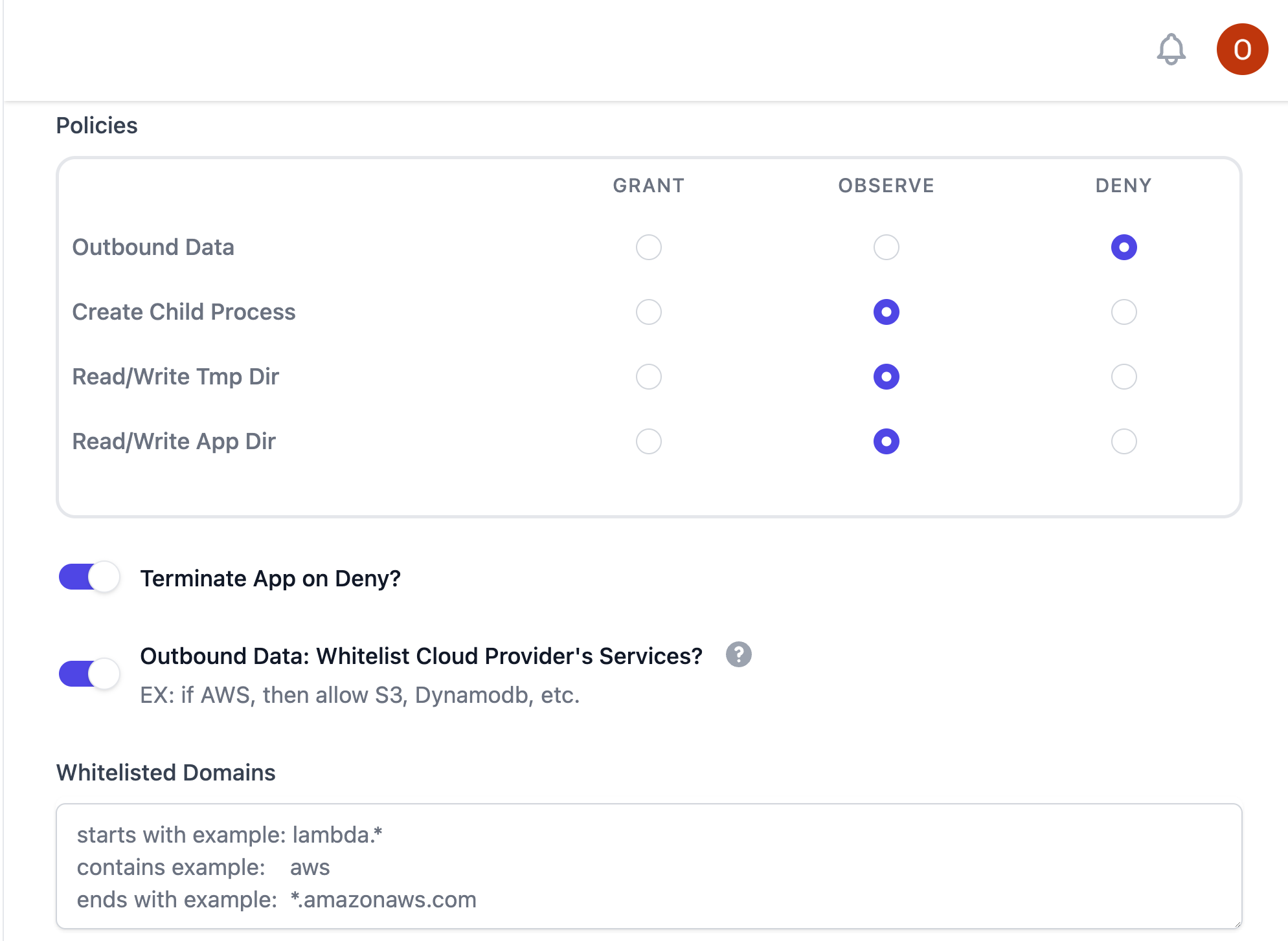 Policy groups allow for any combination of Grant, Observe, Deny actions to be enforced at runtime by your application for the following policies: